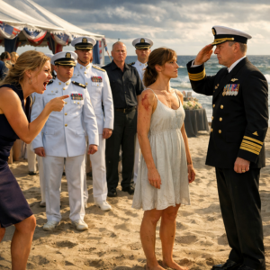 She crossed the sand in a red bikini that looked like it had a sponsorship deal, every step a practiced glide. Her friends—polished, glossy people with professional smiles—followed like satellites. A cluster of young Navy officers lingered nearby, half curious, half cautious. Some of them recognized me from base events years ago. Most pretended they didn’t.